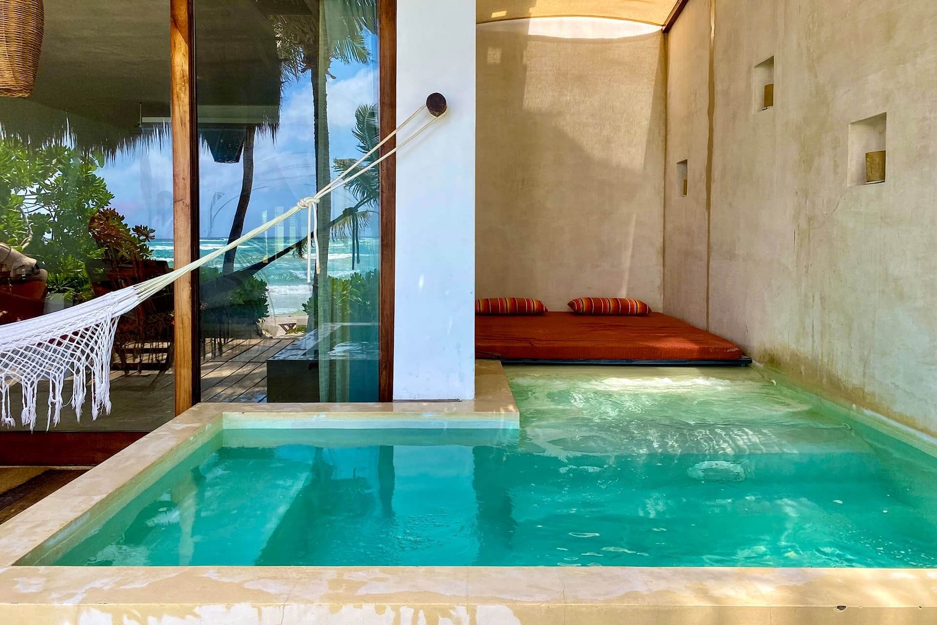 Our beachfront Junior Suites offer breathtaking views from a king-size bed and feature an inside sitting area. Enjoy the luxury of an open-air private plunge pool, facing the ocean, with a queen-size sofa, two loungers and a hammock for peaceful relaxation. Additionally, a queen-size sun bed is available at the back, overlooking the hotel's pool. One of the remarkable features of our Junior Suites is a sliding window in the bathroom, allowing you to soak in the ocean view while enjoying a relaxing bath in the hot tub. The beach area in front of your suite is exclusively reserved for our guests, ensuring privacy and exclusivity. Just a few steps from your room, you can indulge in the beauty of the Caribbean beach. For your convenience, a queen-size beach bed is assigned with your room number.